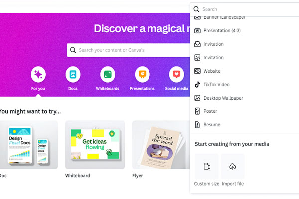 Canva offers a broad selection of standard sizes for various design types, including social media posts, posters, and business cards. You can create a custom size if, however, the size you require is not offered by the preset choices.